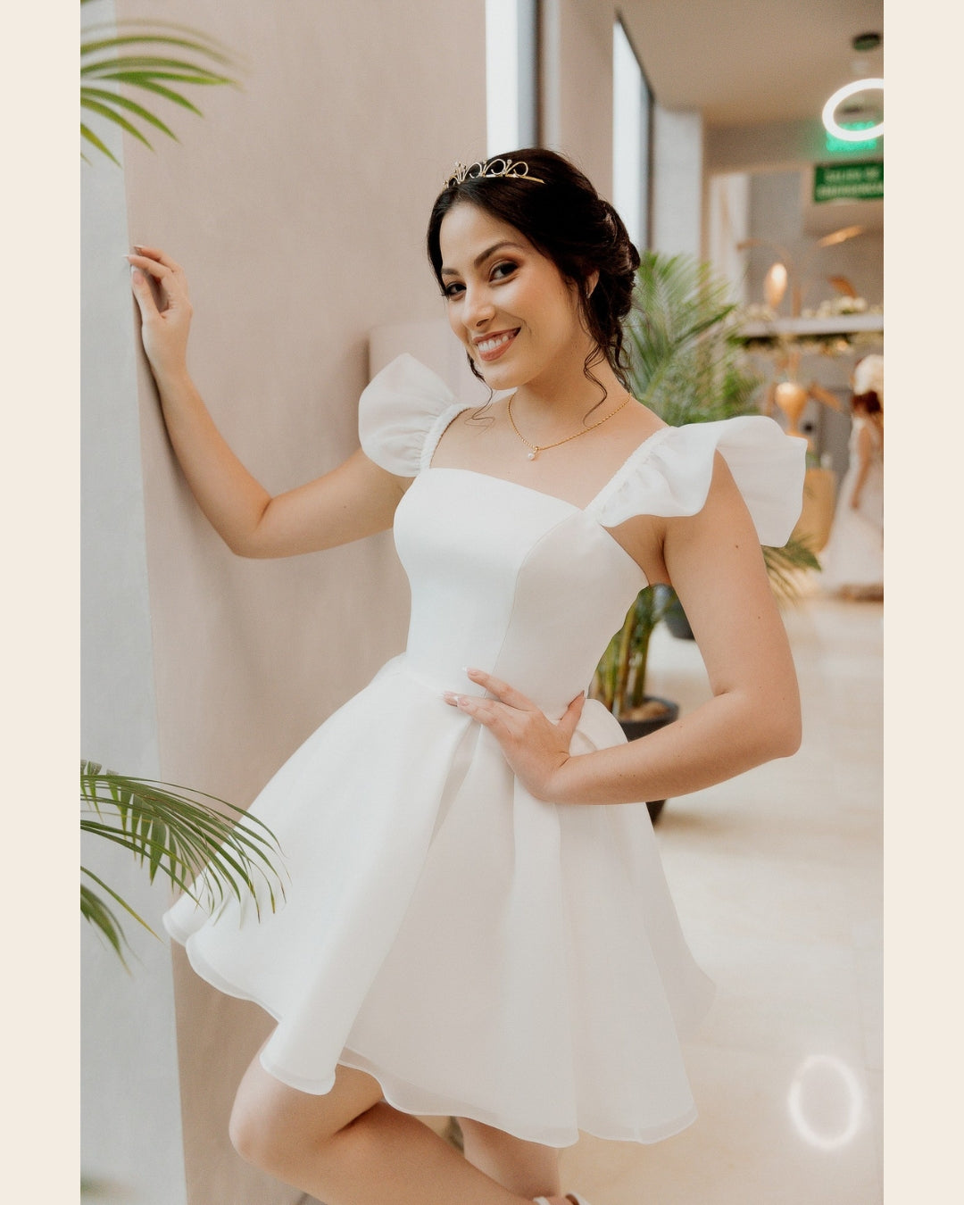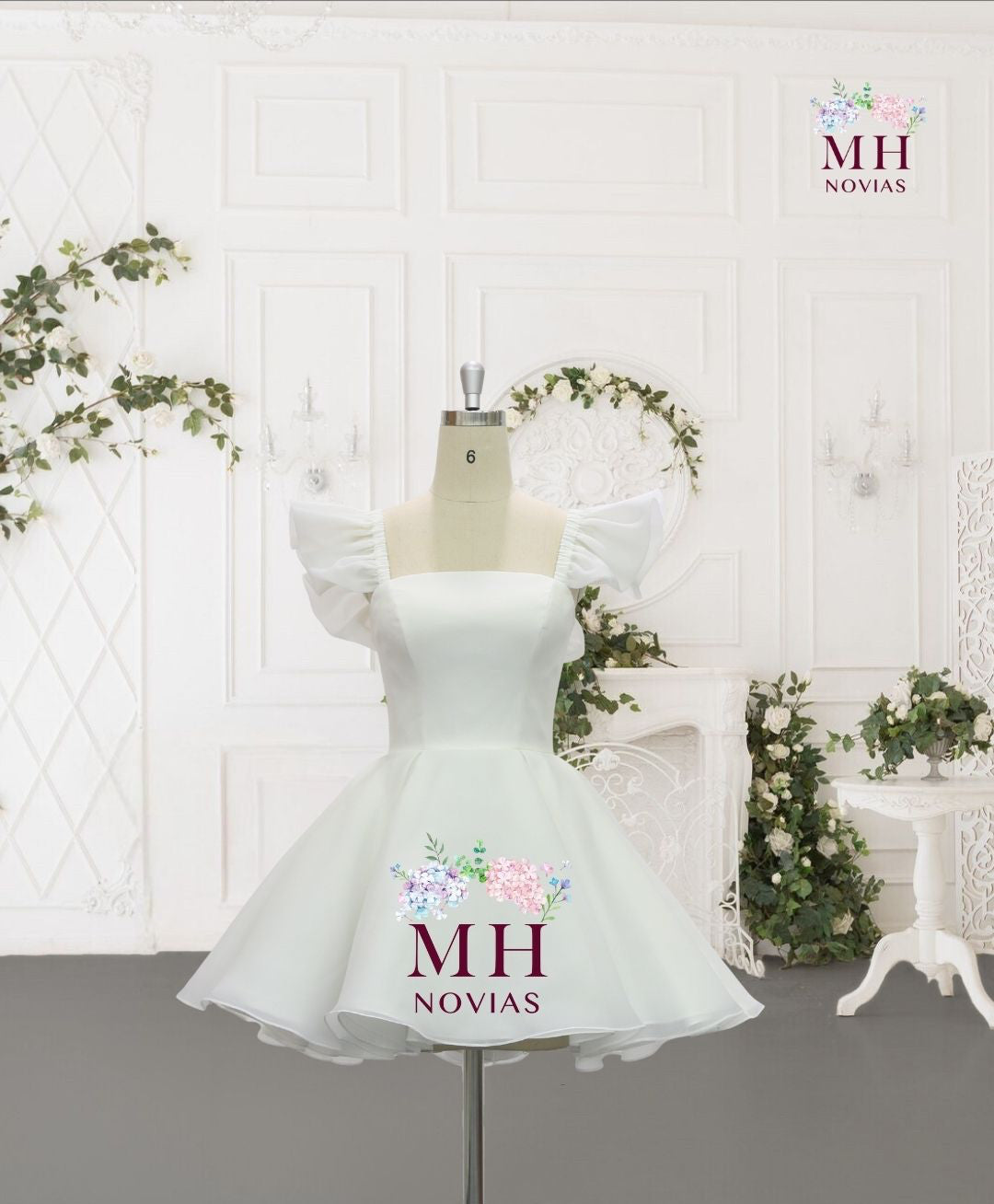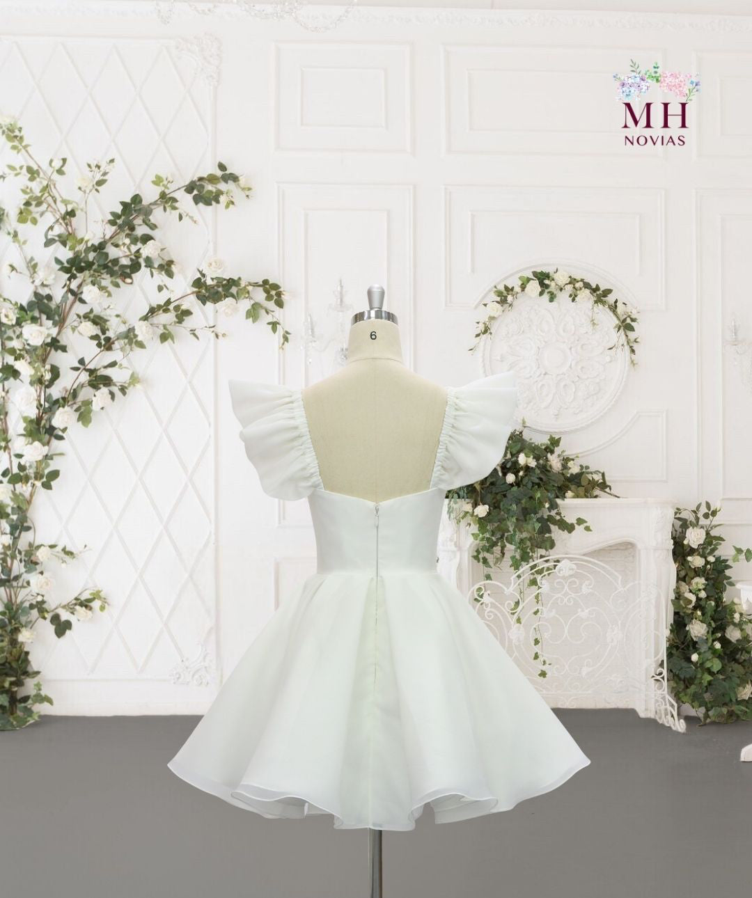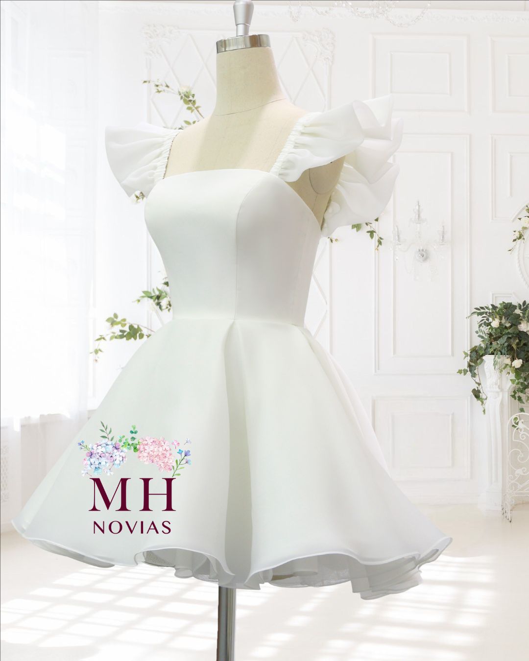Vestido corto de novia, hecho de organza y estructura de bustier interna. Con un escote cuadrado, tirantes volados que hacen función de manga muy corta, y una falda con amplio volumen.