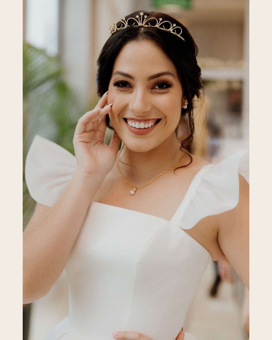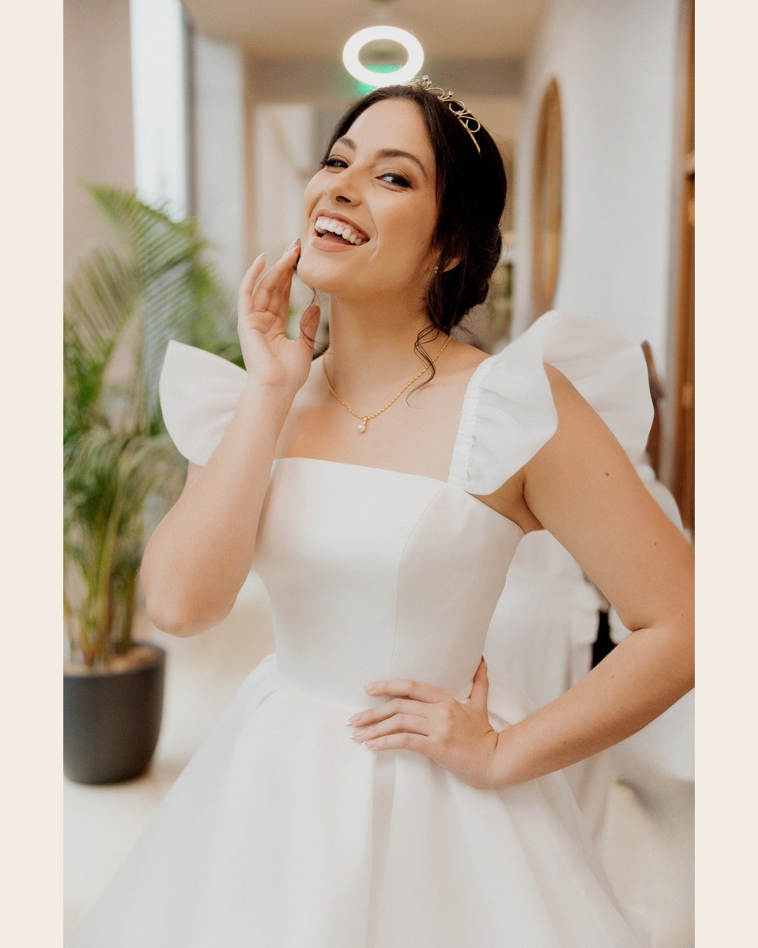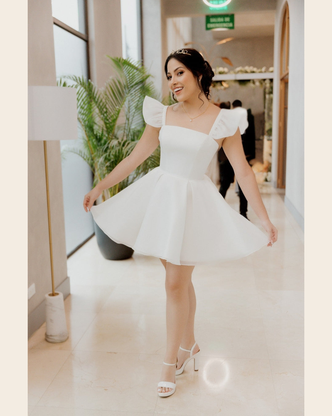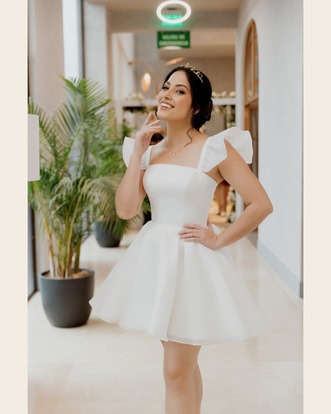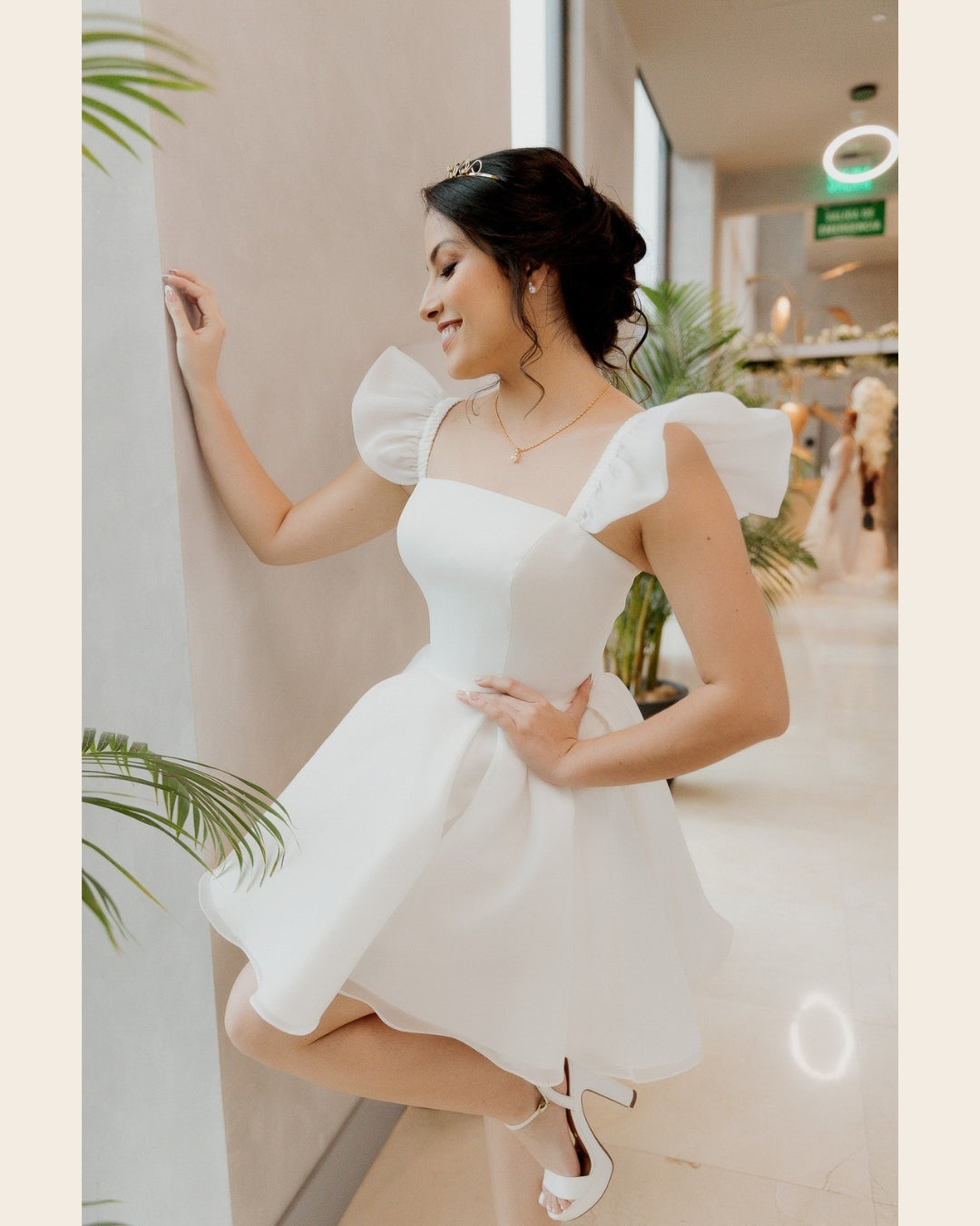 Vestido corto de novia, hecho de organza y estructura de bustier interna. Con un escote cuadrado, tirantes volados que hacen función de manga muy corta, y una falda con amplio volumen.